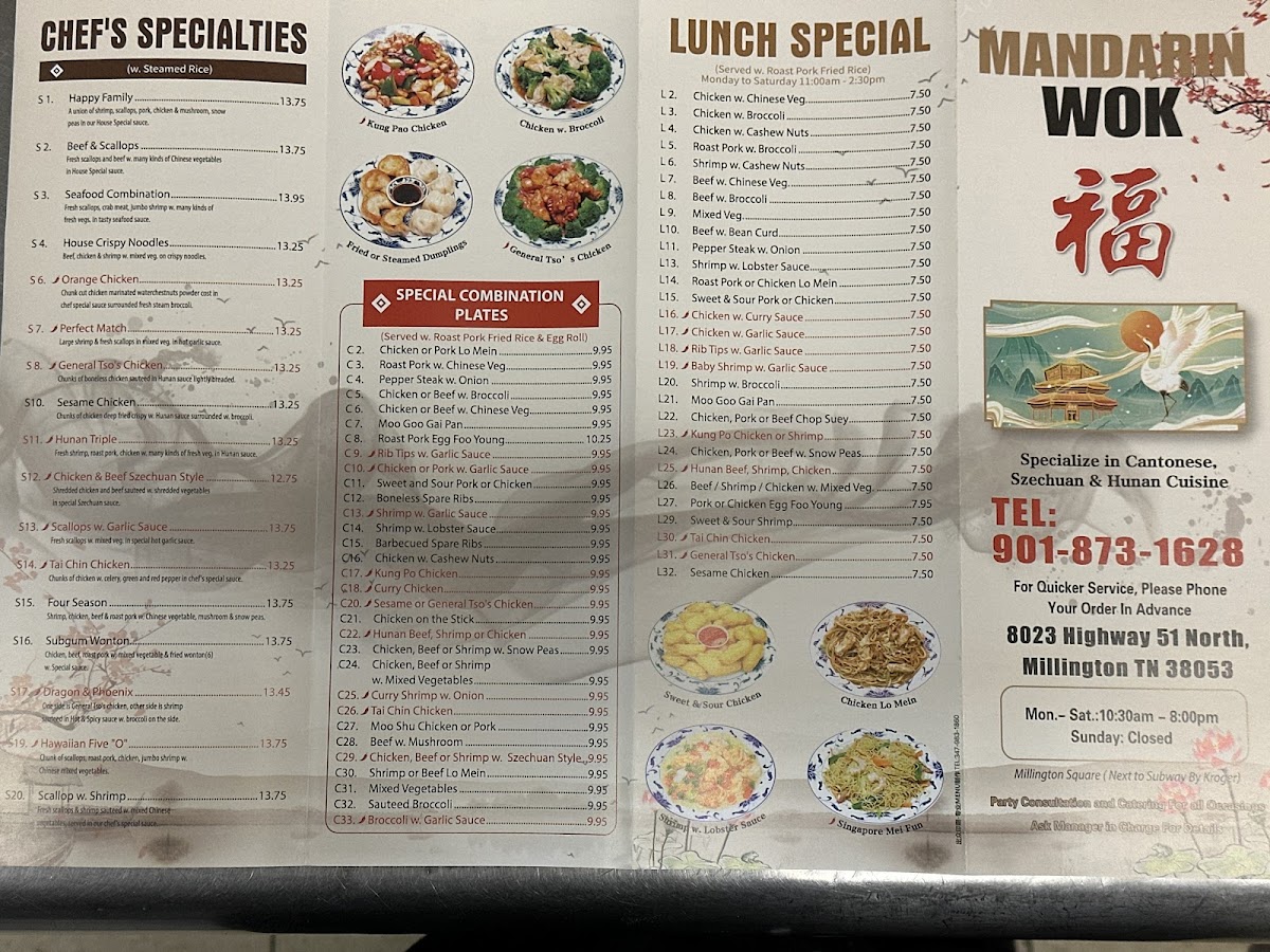 Welcome to Mandarin Wok, a charming destination for Chinese cuisine nestled in Millington, TN. This gem offers a delightful array of dishes that cater to diverse tastes, from savory Szechuan Wontons to crispy Hot & Spicy Chicken Wings. The menu not only showcases traditional favorites but also surprises with specialties like Fried Scallops and Crab Meat Rolls, ensuring there’s something for everyone.